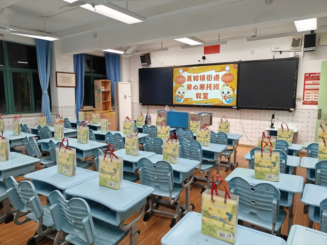 真如镇街道小学生爱心寒托班每班配备一名班主任老师和五位大学生志愿者,与晨检人员、安保人员共同为孩子们的学习生活保驾护航。旨在为孩子们提供一个安全、有趣、充实的寒假环境,解决家长们的后顾之忧,同时丰富孩子们的假期生活。