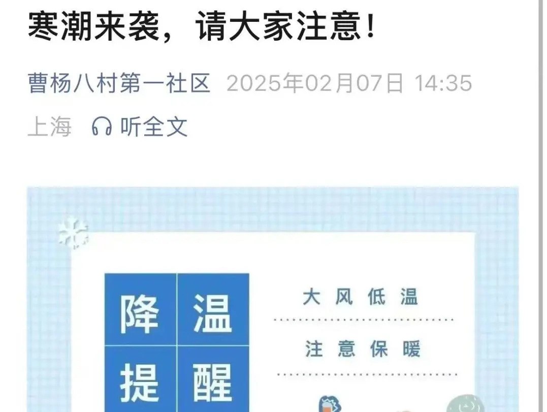 2025年02月08日 来源: 长征镇寒潮来袭,气温骤降,真如镇街道迎“寒”而上,整合工作力量,多措并举,为居民筑起一道坚实的温暖防线。
