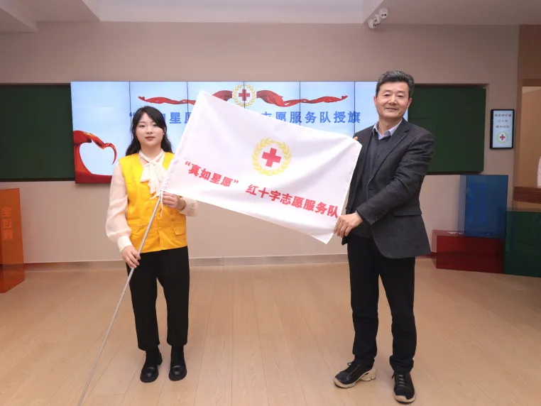 陈建华为 “真如星愿” 红十字志愿服务队授旗