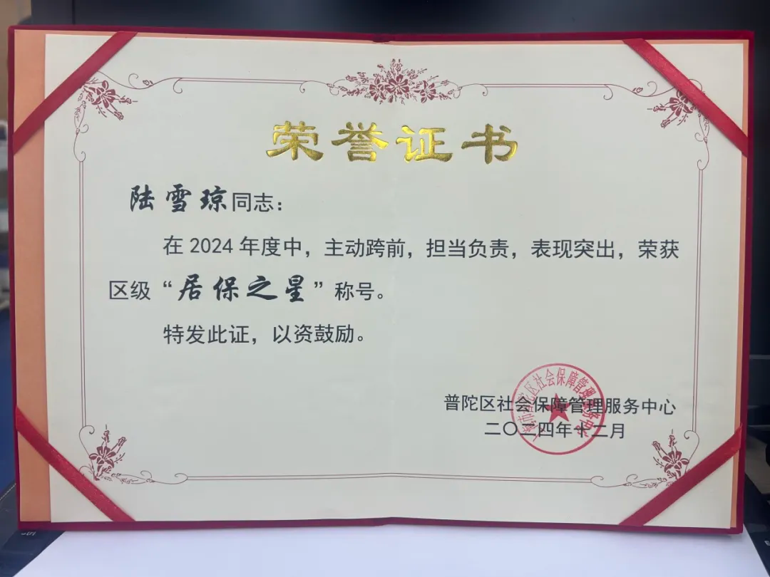 凭借出色的业务能力和全心全意的服务精神,陆雪琼荣获2024年度普陀区“居保之星”称号。陆雪琼表示,将继续秉持初心,不断提升服务水平,为更多居民送去温暖。