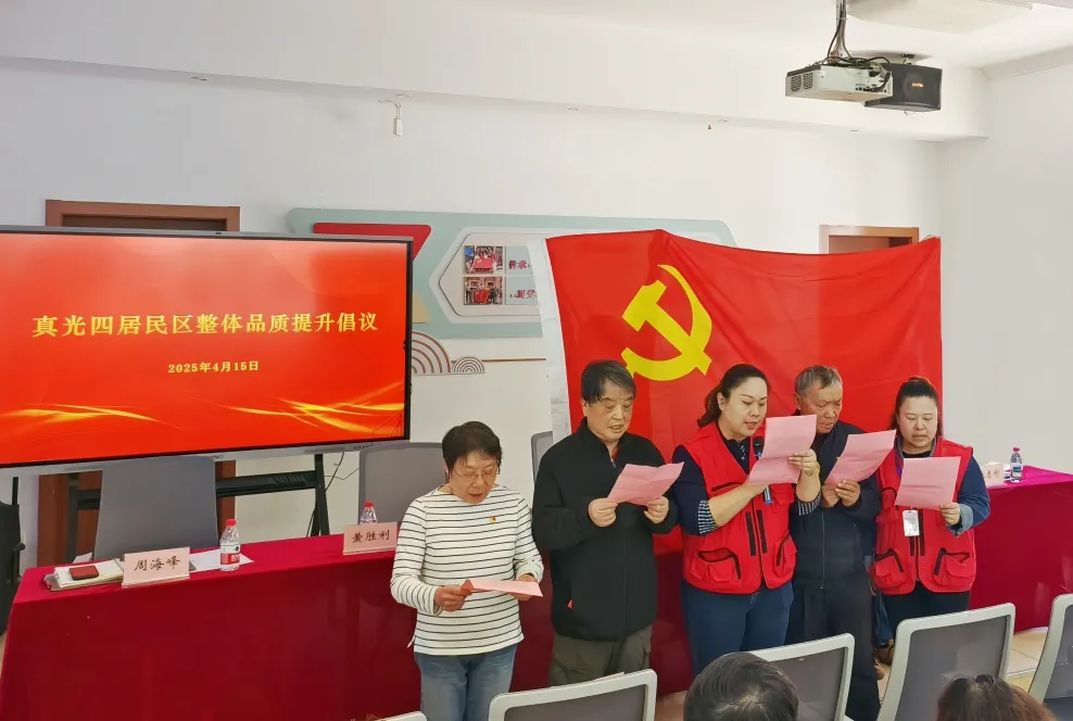 现场,居民区党总支书记米兰带领党员发出倡议:党员带头、率先垂范,为真光争光。凝聚群众、珍惜机遇,共建美丽家园。软硬结合、品质提升,争做标杆示范。