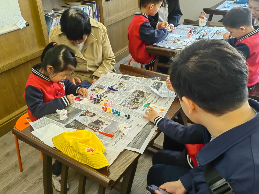 书签DIY的创作之旅,进一步开拓了孩子们的思维,为他们插上了“想象的翅膀”。图书馆老师为每个家庭都准备了颜料、画笔、书签纸、流苏穗子等材料,并简要介绍了书签的制作方法。