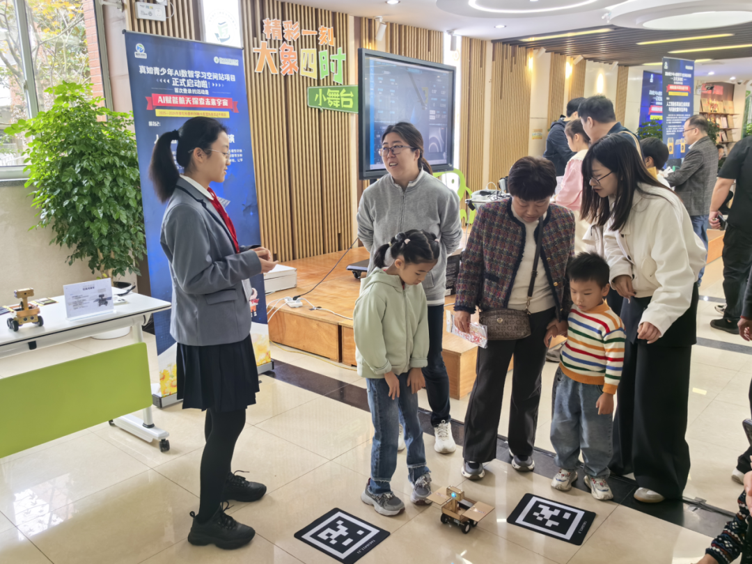 活动现场,四个AI航天知识的体验摊位成为了连接社区家庭与尖端科技的桥梁。在街道的广泛动员与学校的专业筹备下,以往看似“高冷”的航天黑科技,变得生动可触。