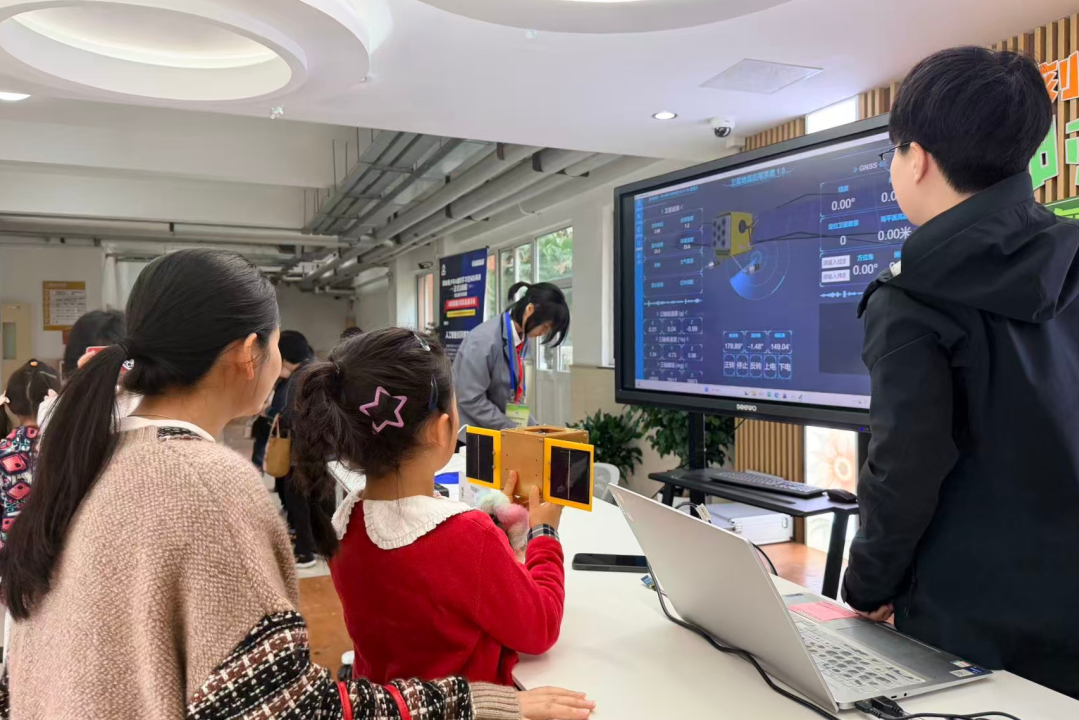 在仿真遥感卫星摊位,孩子们在街道志愿者和学校老师的共同引导下,亲手调整卫星模型姿态,观察数据变化。