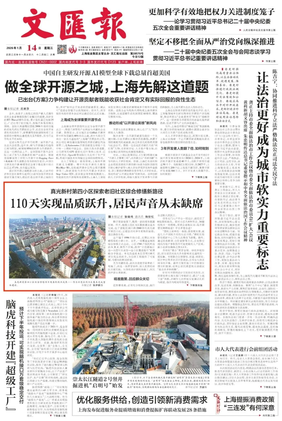 2026年1月14日《文汇报》头版报道