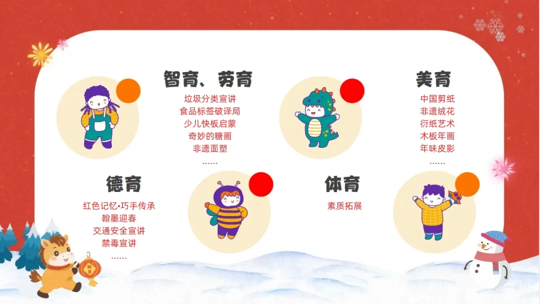 本次爱心寒托班紧密结合小学生身心特点与发展需求,围绕“德、智、体、美、劳”五育融合理念,以“在玩中学、在学中玩”为导向,充分整合优质资源,精心打造了一系列丰富有趣的活动。内容涵盖红色记忆、益智思维游戏、素质拓展、法治反诈启蒙、非遗文化体验、心理情绪赋能等,全方位助力孩子假期成长。